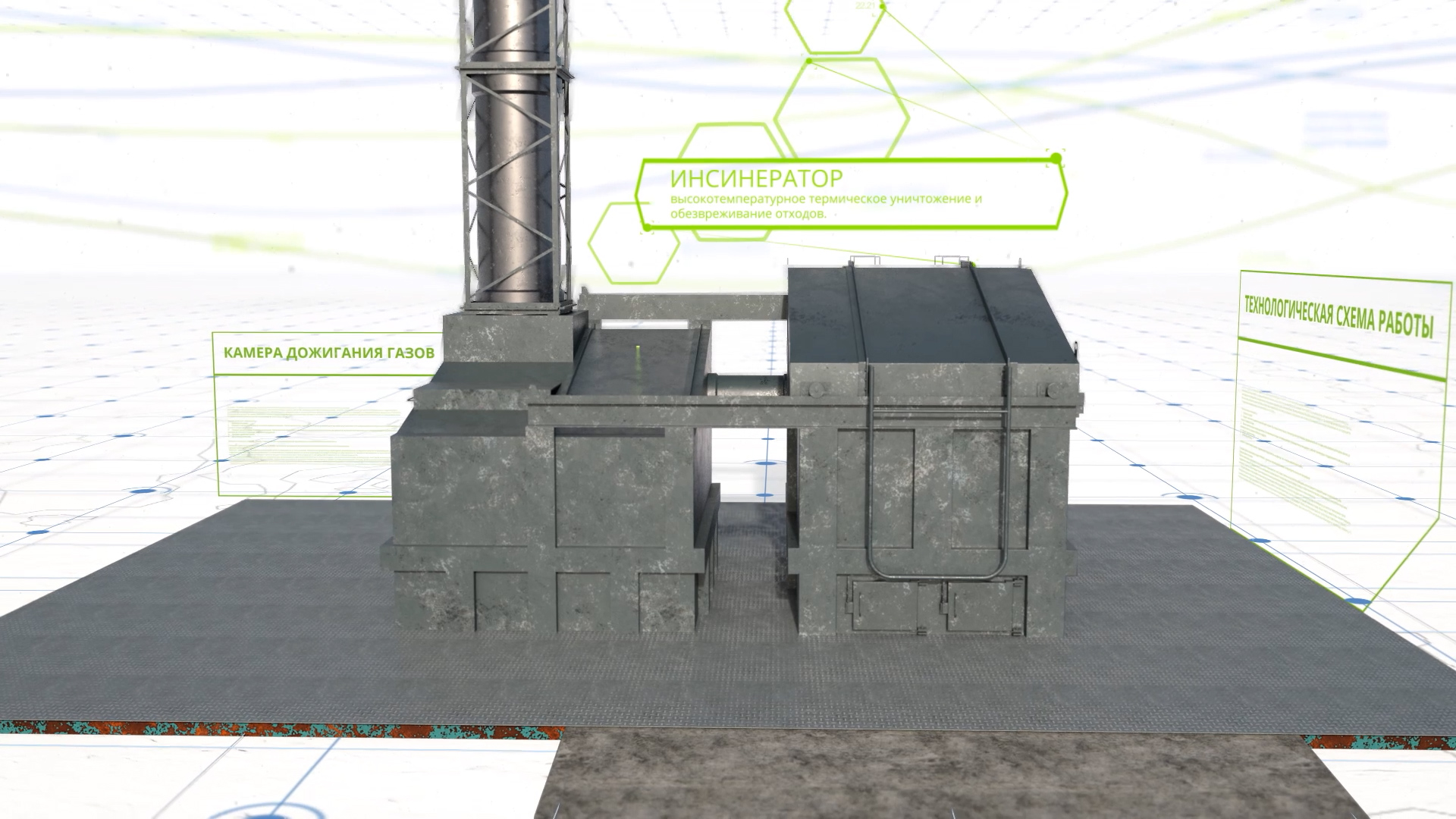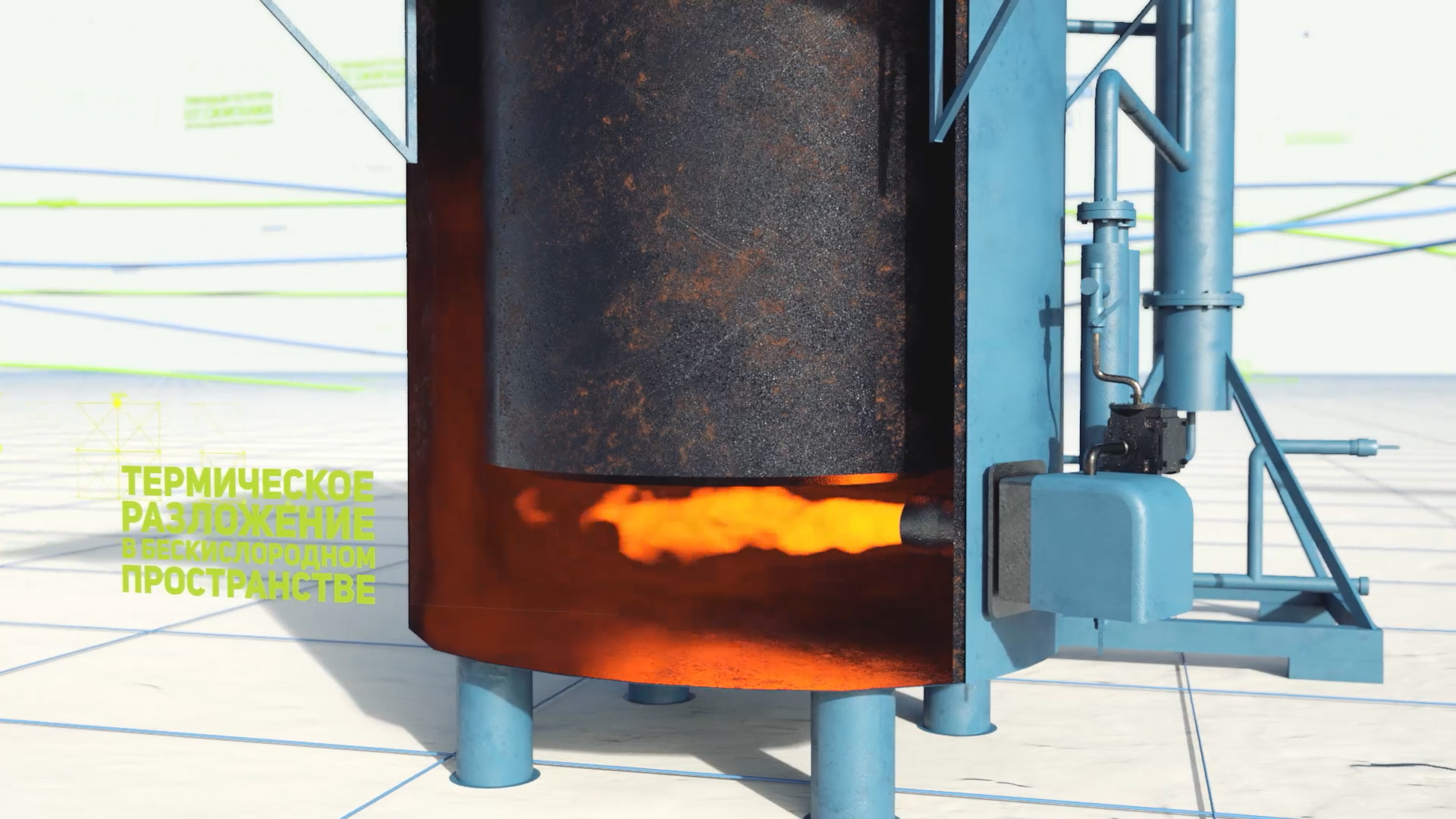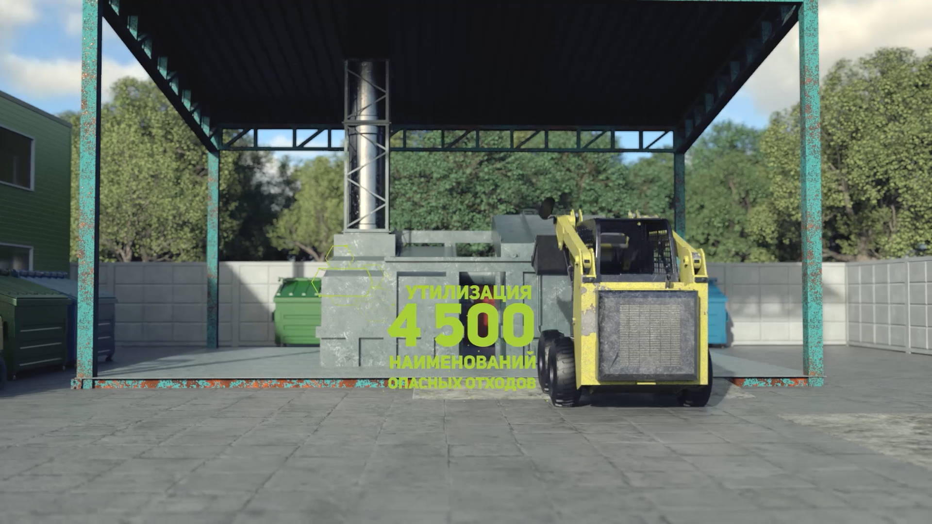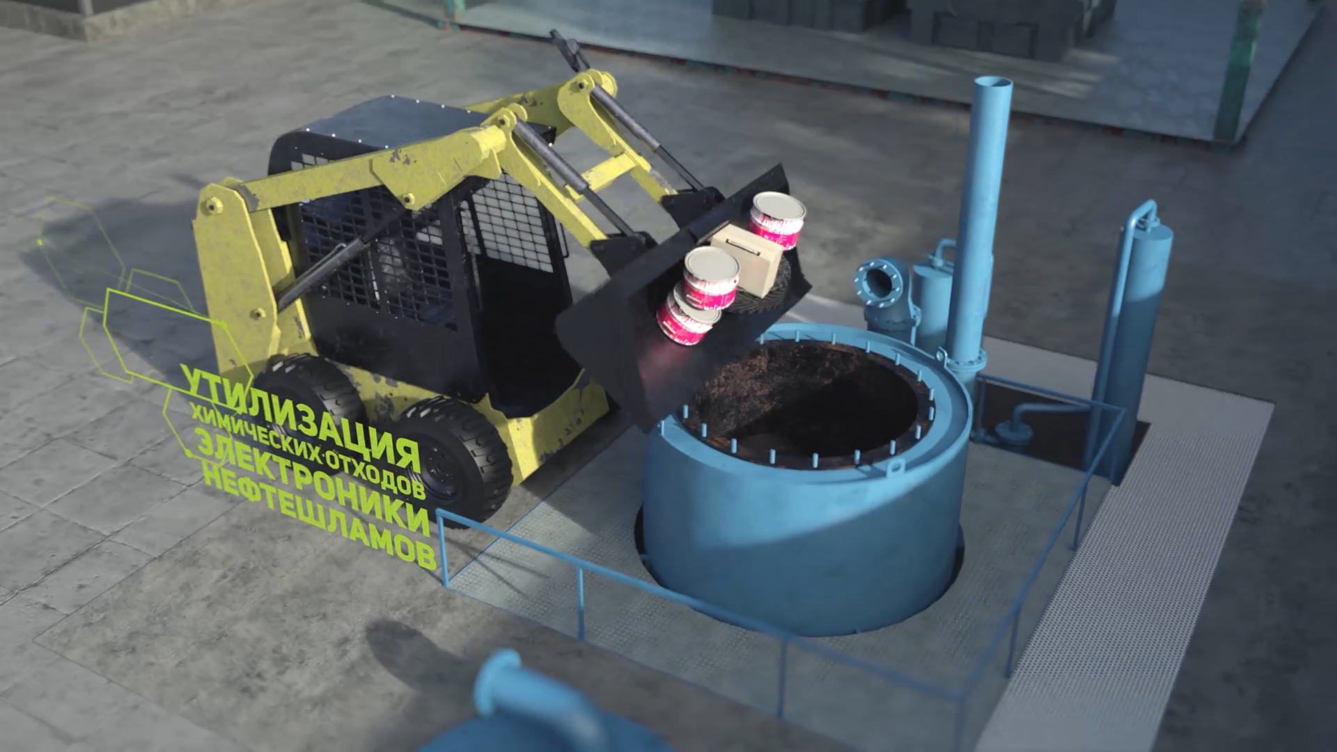 The animations demonstrate the full technological cycle: from waste loading and handling to thermal decomposition in an oxygen-free environment, followed by gas afterburning, material separation, and final recycling stages. Each step is presented with precise visual storytelling and realistic simulations to ensure both clarity and credibility.